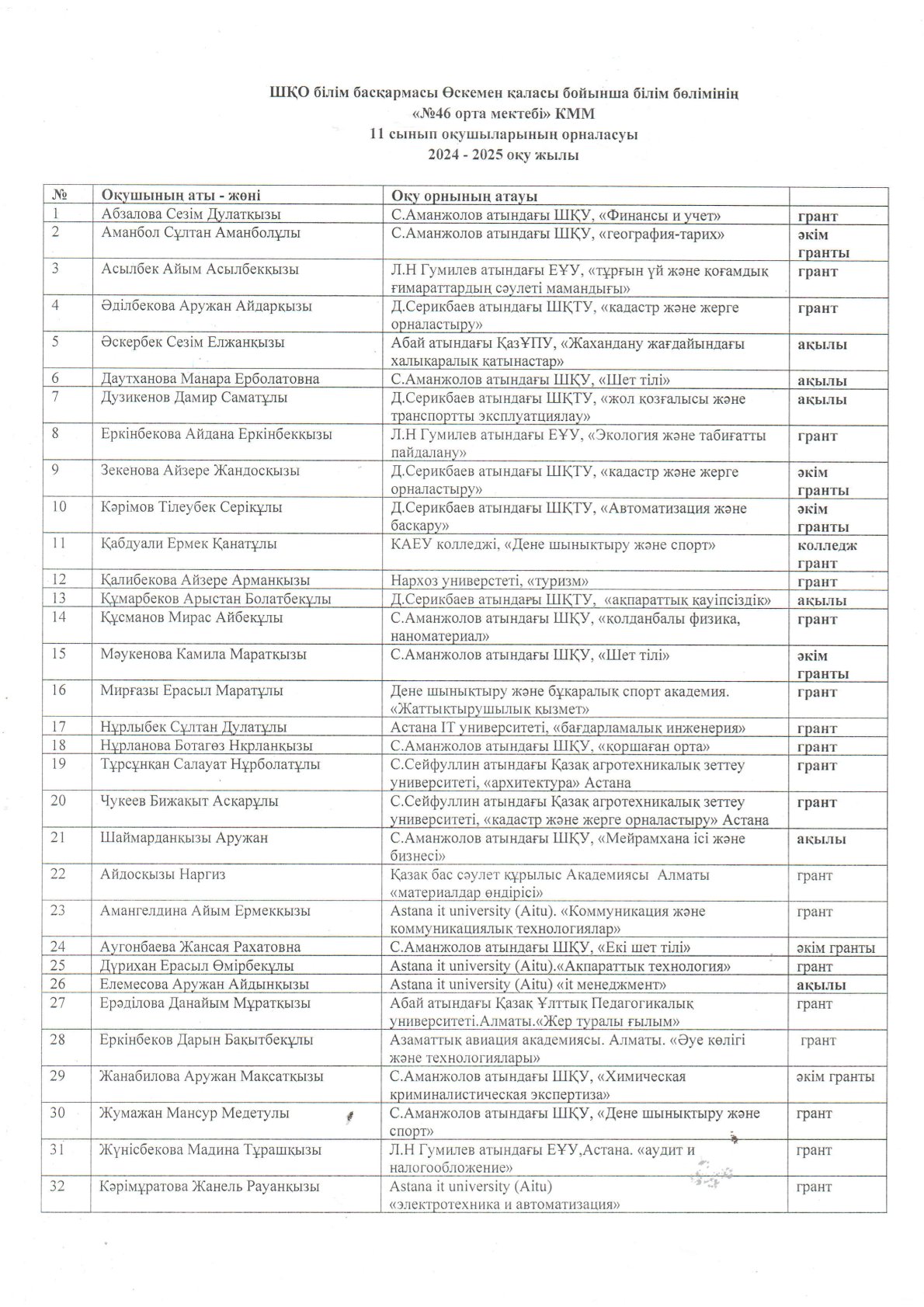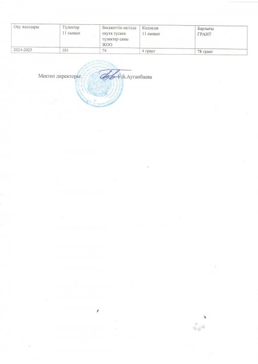 » 11-сынып түлектерінің 2024-2025 жж оқуға грантқа түсуі