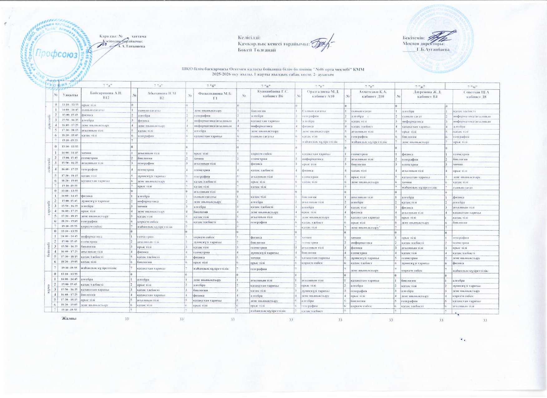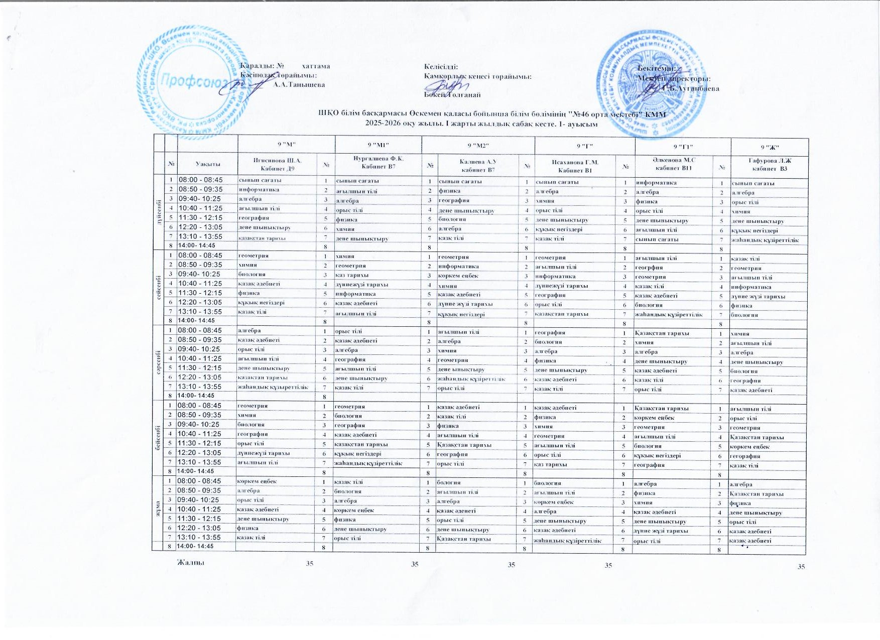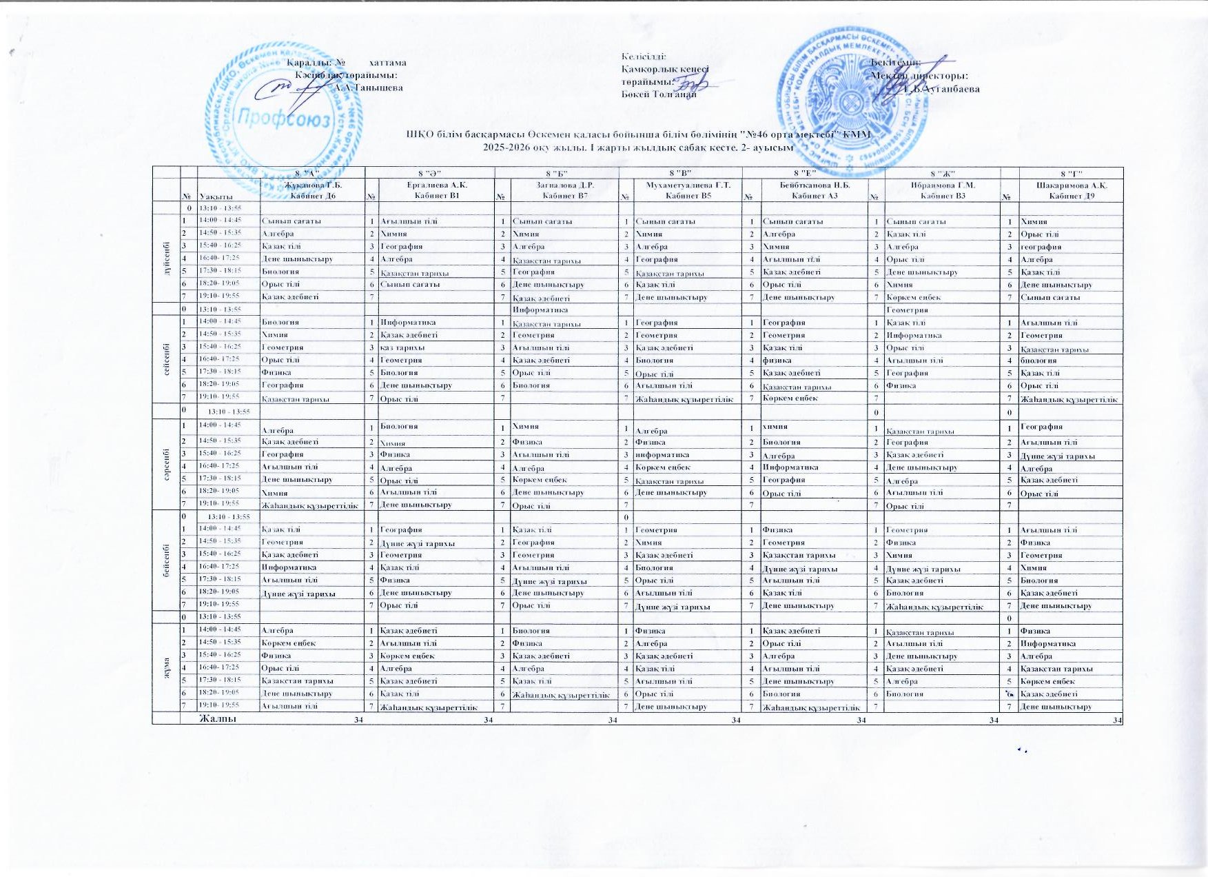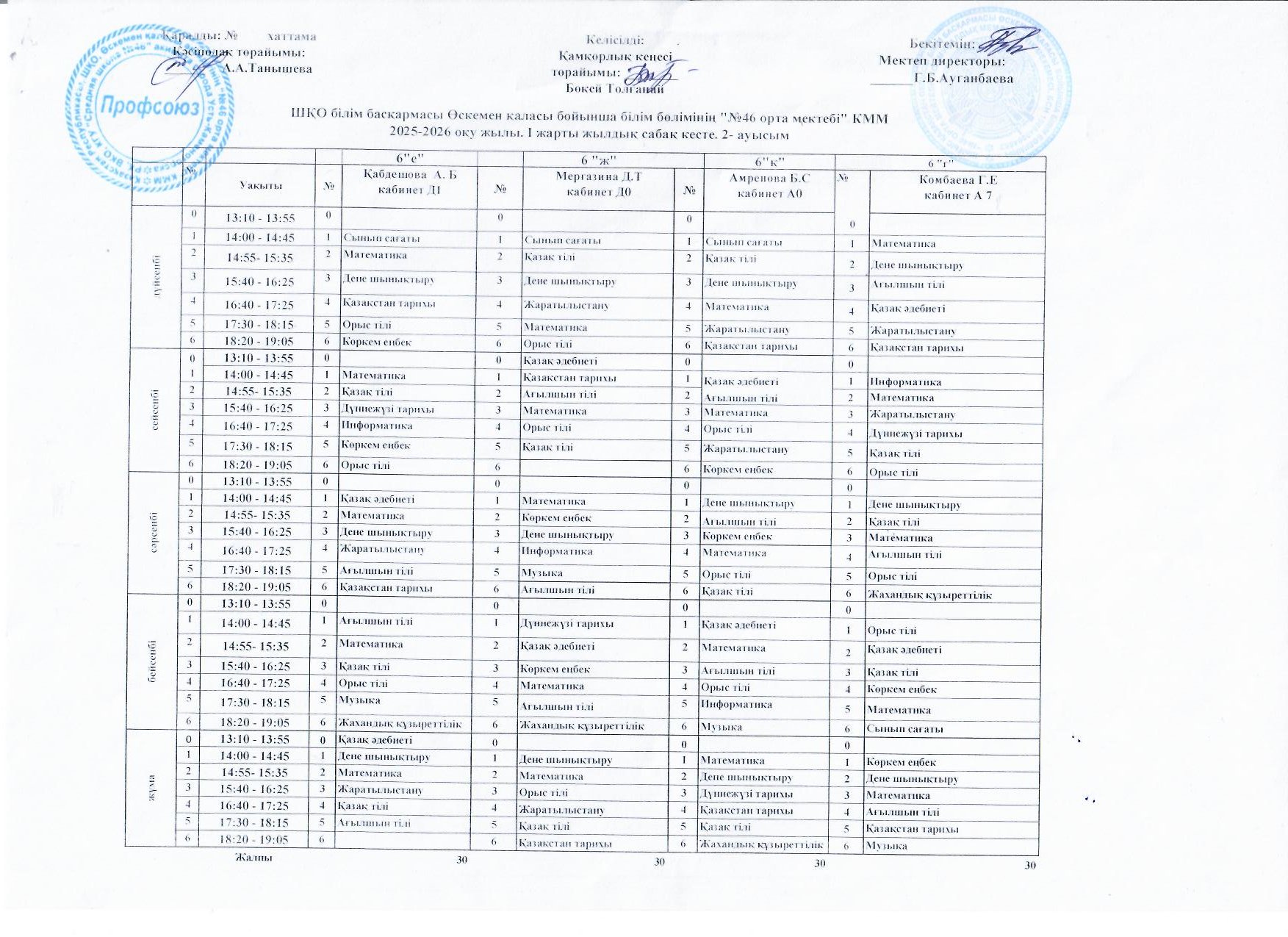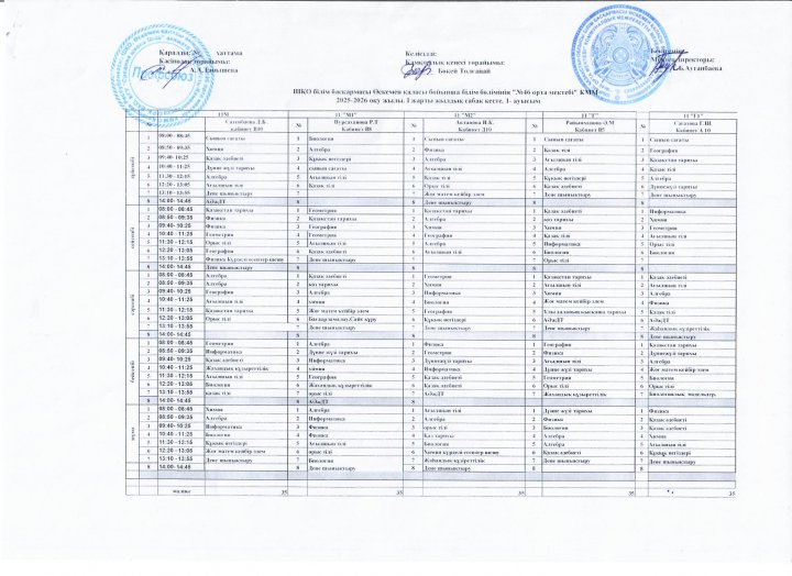 Сабақ кестесі 2025-2026 жж I жарты жылдық